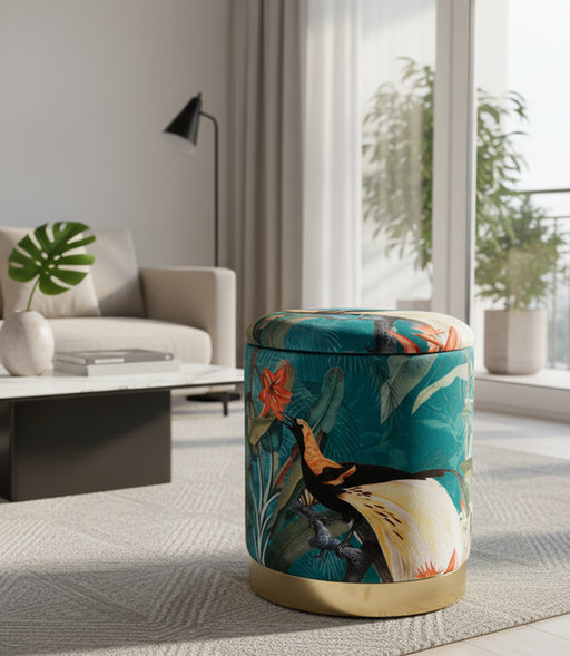 عرض التفاصيل الكاملةمقعد تخزين جانبي نورديك مخمل أزرق برسمة طيور