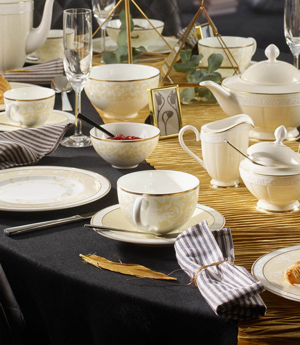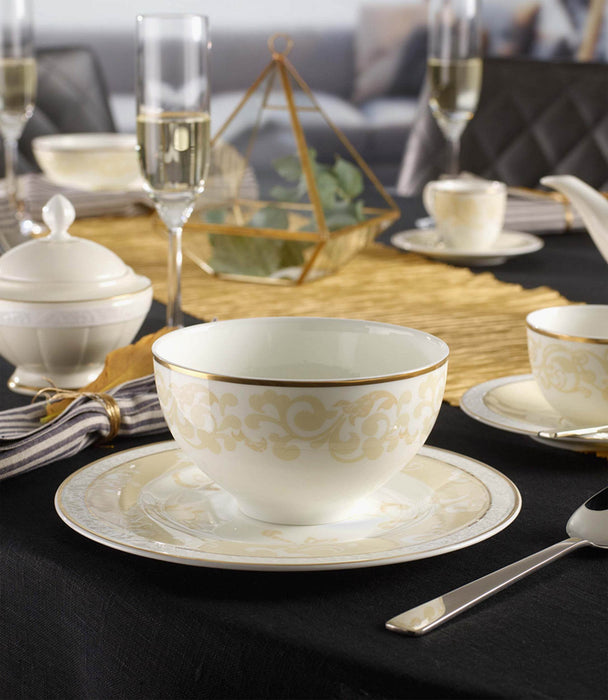 يشكل هذا الوعاء جزءًا من مجموعة أواني الطعام الأنيقة والفاخرة من فيليروي آند بوخ. العاج هو الخزف الفاخر والنبيل المصنوع من الصين العظمية عالية الجودة والذي يذهل بمزيجه الناجح من الأبيض والكريمي بالإضافة إلى نقشه الجميل. تم تزيين كل قطعة من هذه المجموعة بطبقة ذهبية مما يجعلها تبدو أكثر فخامة. . تتناسب المجموعة بشكل مثالي مع الأجواء الكلاسيكية وكذلك مع الطراز الكلاسيكي الحديث ويمكن استكمالها بشكل مثالي بأدوات المائدة أو البورسلين أو أغطية الطاولة المطابقة من فيليروي آند بوخ.