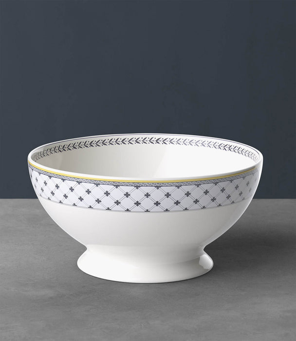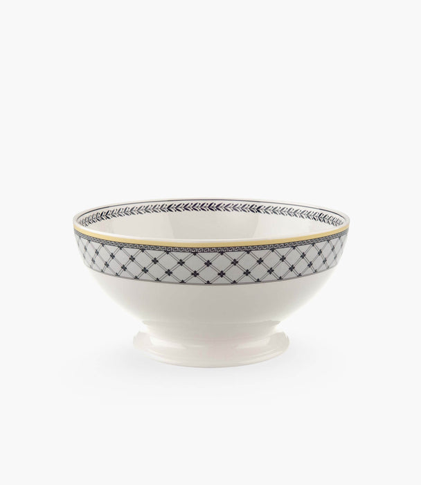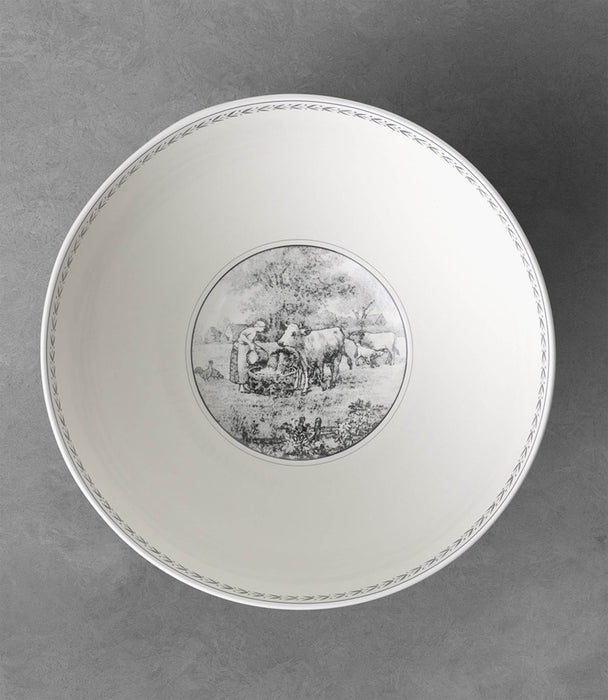 This salad bowl forms part of Villeroy & Boch's country style pattern Audun Ferme. With this pattern, Villeroy & Boch exquisitely bridges past, present and future inspired by copper engraved designs from the turn of the last century. Pastoral scenes in black and white have been freshened up by a creamy yellow accent border and other graphic ornamentations. 4 patterns together yield a strong fashion statement to dress up your table or hang decorative plates on the wall. The 4 ranges are: Femme, Promenade, Fleur and Chase. Audun is a small village in what is now the Lorraine Provence of France and was the first pottery set up by the Boch members of the family