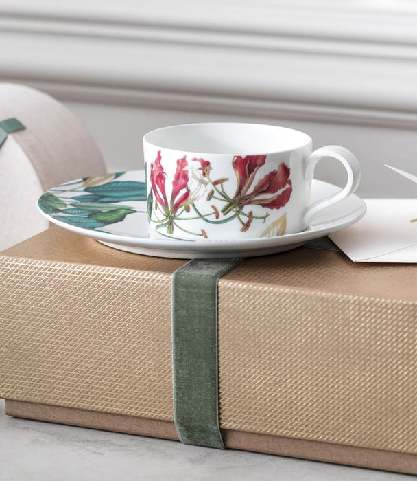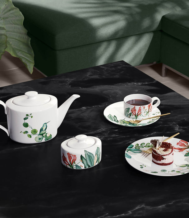Inspired by the beauty of Avarua, the Avarua design pays homage to the travels of the navigator and explorer James Cook and tells the story of his discovery with artistic flair. The tropical look is rounded off with fine gold lines that conjure up a fantastic, three-dimensional effect that brings the collection to life- Featuring botanical motifs and soft colours, the tea cup from the Avarua collection lets you enjoy your favourite hot drink while dreaming of a tropical place like the Cook Islands- Be transported into a world of birds of paradise and exotic plants