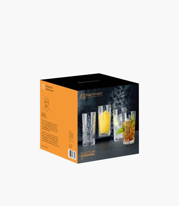 The "Nachtmann NextGen Project" resulted in the development of the "Sculpture" series in 2012. The series explores light, reflections, and refractions by transforming solid rock into crystal. In this design, the clarity of the crystal is balanced by the intricate geometry of the embellishment. The "Sculpture" glassware's rough surface improves grip and lowers the possibility of slipping. Their geometric pattern improves the way light reflects off the glass, so it's not just for show. A stunning display of light refraction is produced by the intersecting lines and textured surface, giving each item a sparkle and brilliance that is guaranteed to draw attention.