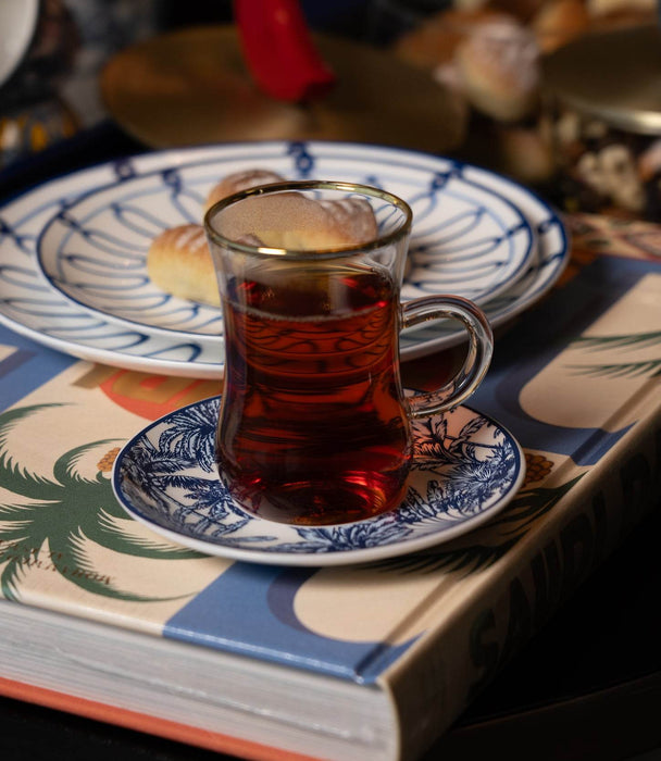 Sip in style with this tea set from the Summer Palm White collection. This exquisite 12-piece set features six glass teacups that elegantly rest on porcelain saucers, beautifully detailed with delicate palm motifs. Designed for everyday use and special occasions while radiating sophistication and charm. Its high-quality materials ensure durability without compromising elegance, making it a classic addition to any tea lover’s collection. Whether for personal enjoyment or as a luxurious gift, this set is made to be a perfect blend of functionality and artistry.