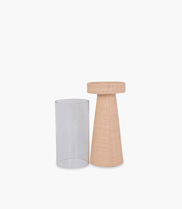 Style your space with this elegant candle holder from the Tranquility collection by Roomours - perfect for illuminating your home with a touch of class and rustic style. It features a raffia-wrapped base and smooth cylindrical glass top that adds a sleek, contemporary touch. This candle holder is both stylish and functional, securely holding your candles while complementing any décor—the finishing touch for any room.