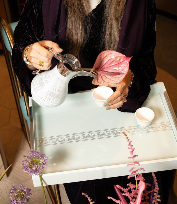 Add a touch of refined elegance to your table with the Zawaya Coffee & Tea Set. Crafted from premium porcelain, this beautifully designed set includes cups, bowls, and a matching tray, all featuring a stunning pearl white meander motif that captures the essence of timeless luxury. Inspired by classic geometric patterns, the Zawaya collection enhances every coffee and tea moment with its understated charm and sophistication. Ideal for both everyday use and elegant gatherings.